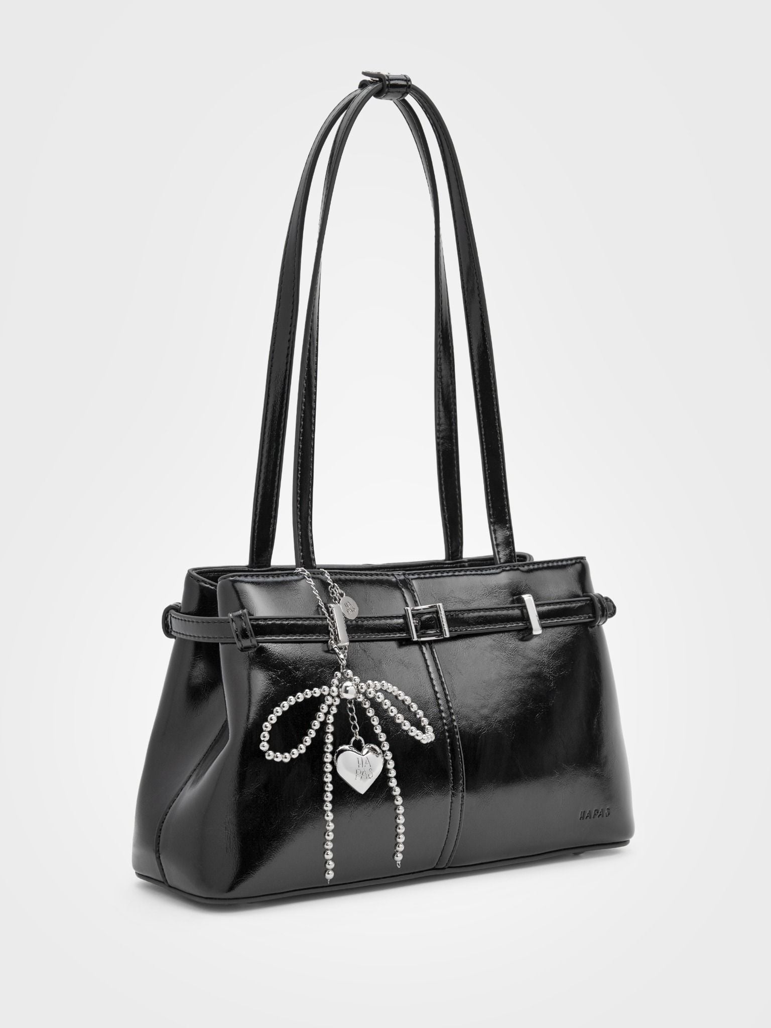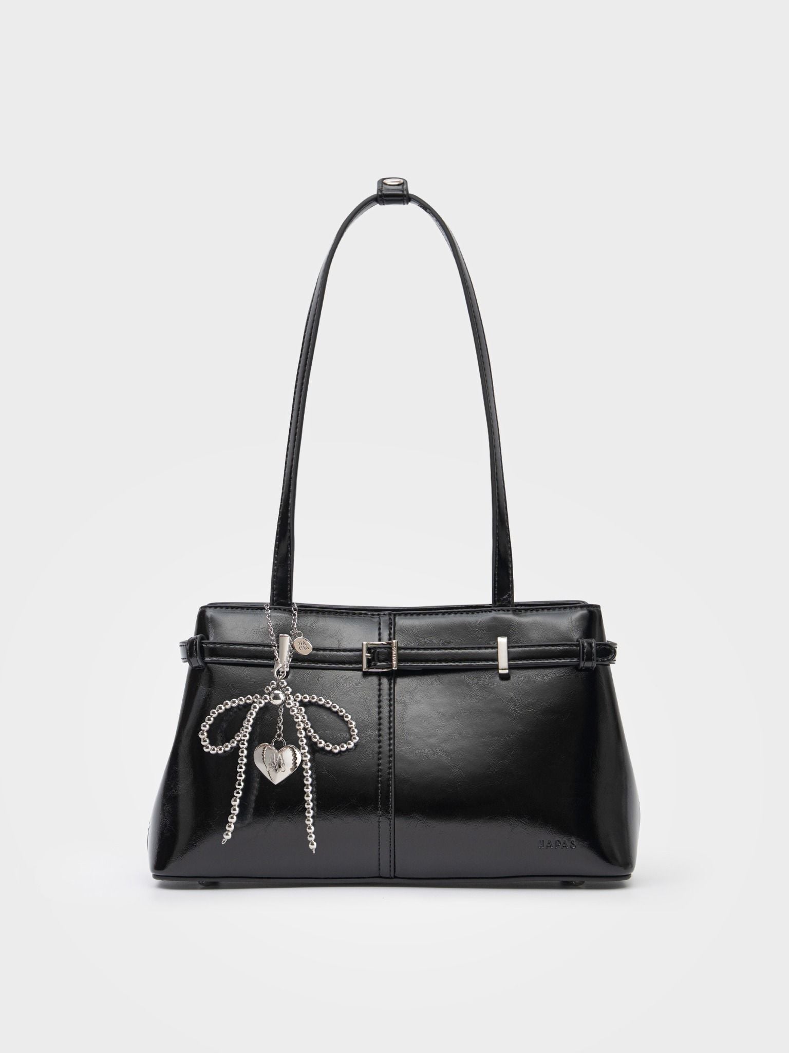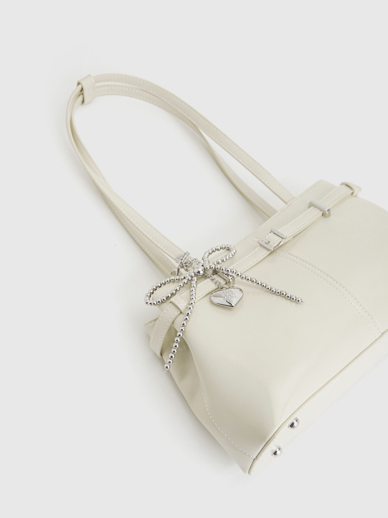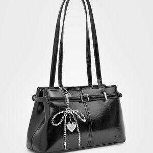 Túi da PU cao cấp, phom dài thanh thoát, dây đeo song song tiện dụng, điểm nhấn charm nơ đính đá và trái tim, phong cách nữ tính hiện đại.