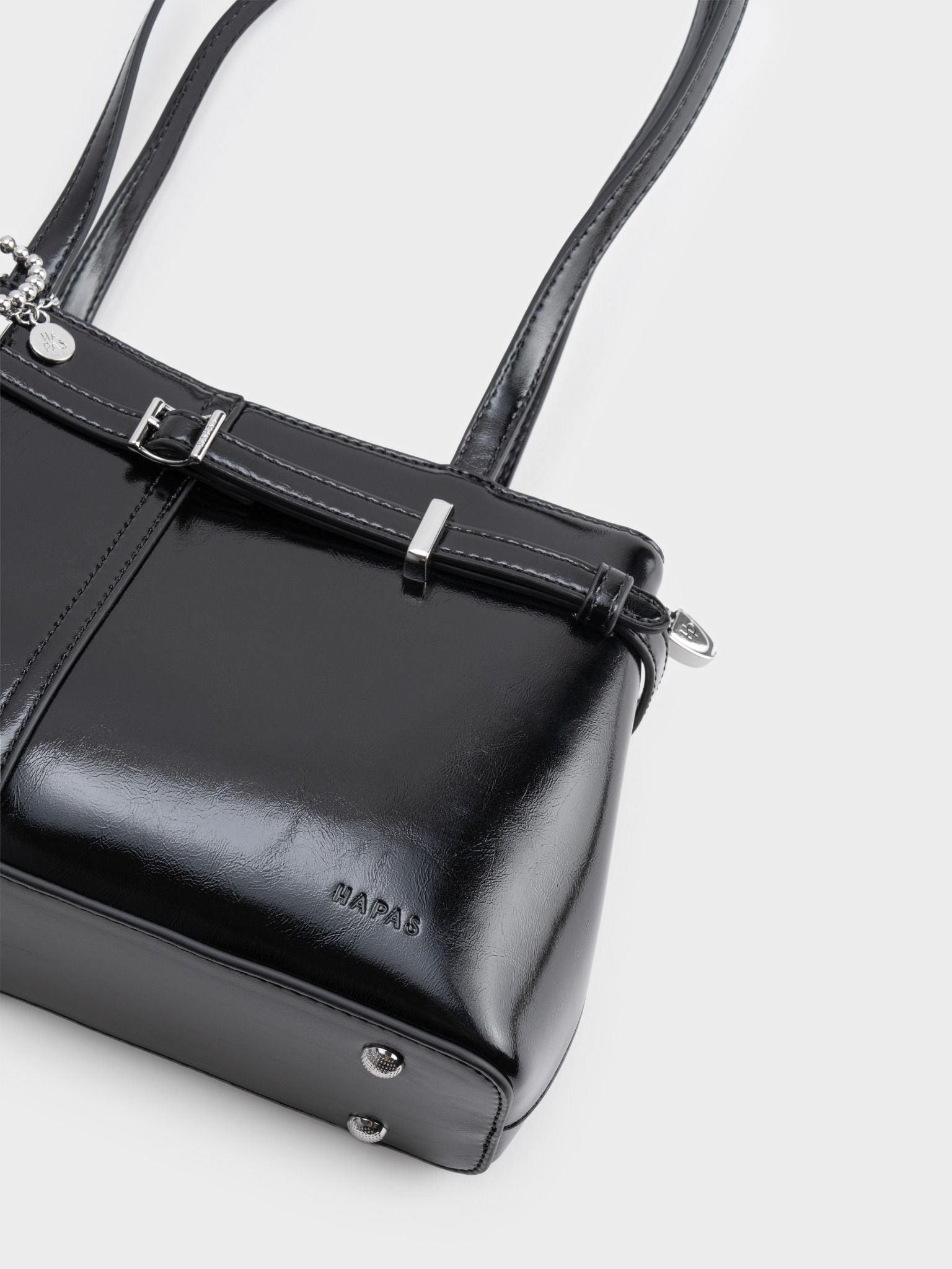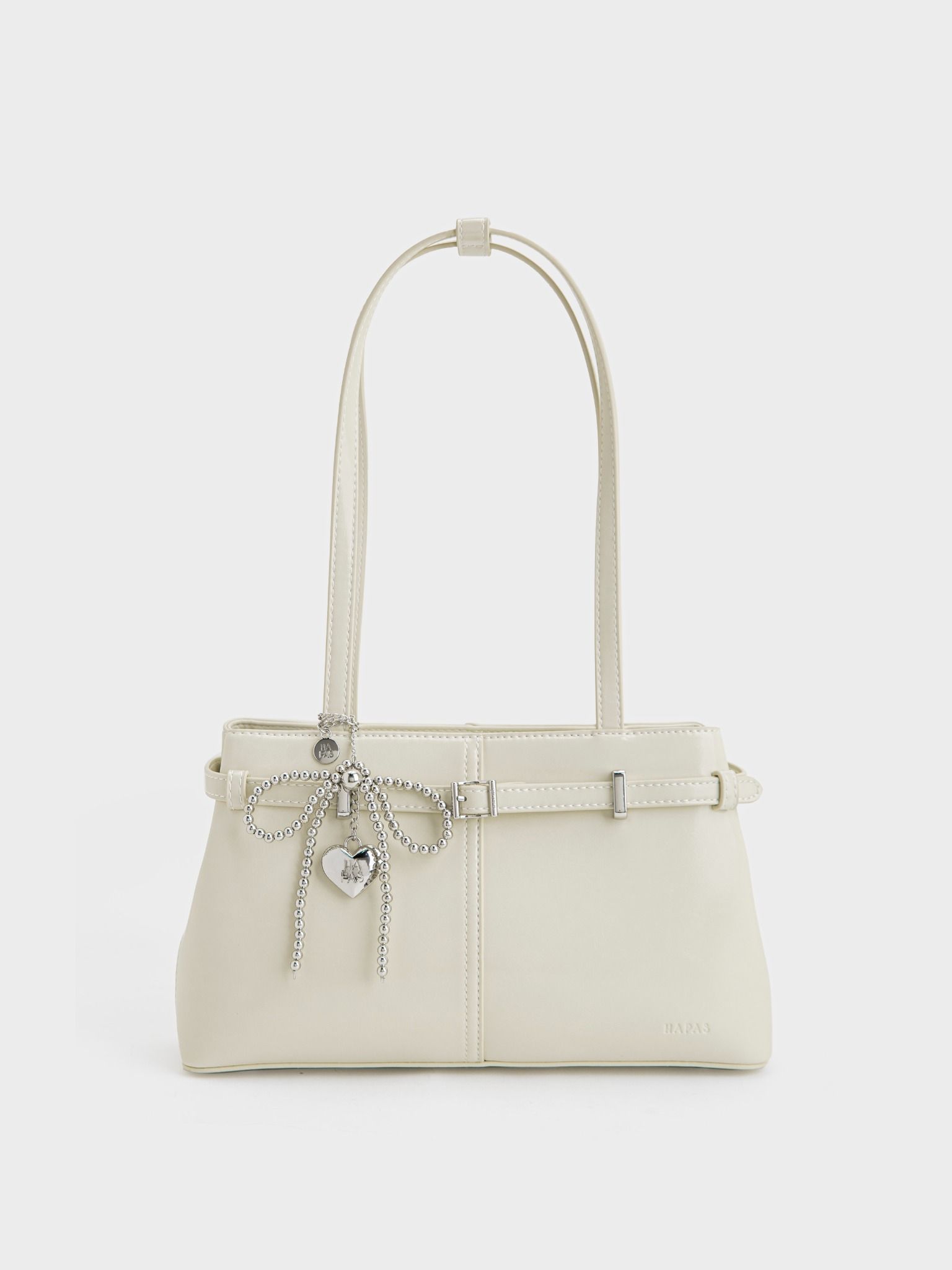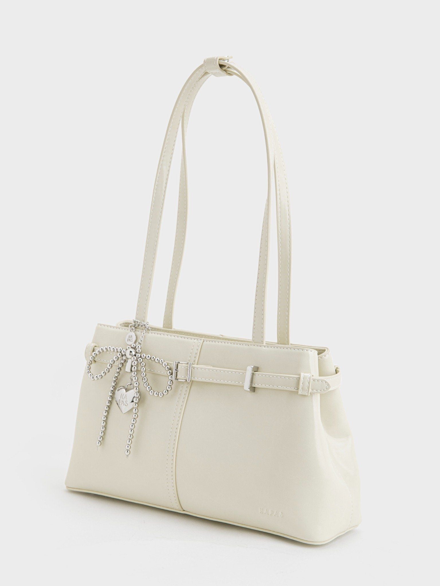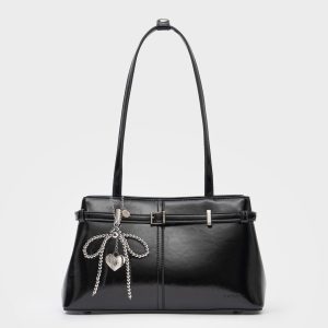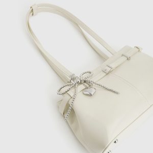 Túi da PU cao cấp, phom dài thanh thoát, dây đeo song song tiện dụng, điểm nhấn charm nơ đính đá và trái tim, phong cách nữ tính hiện đại.