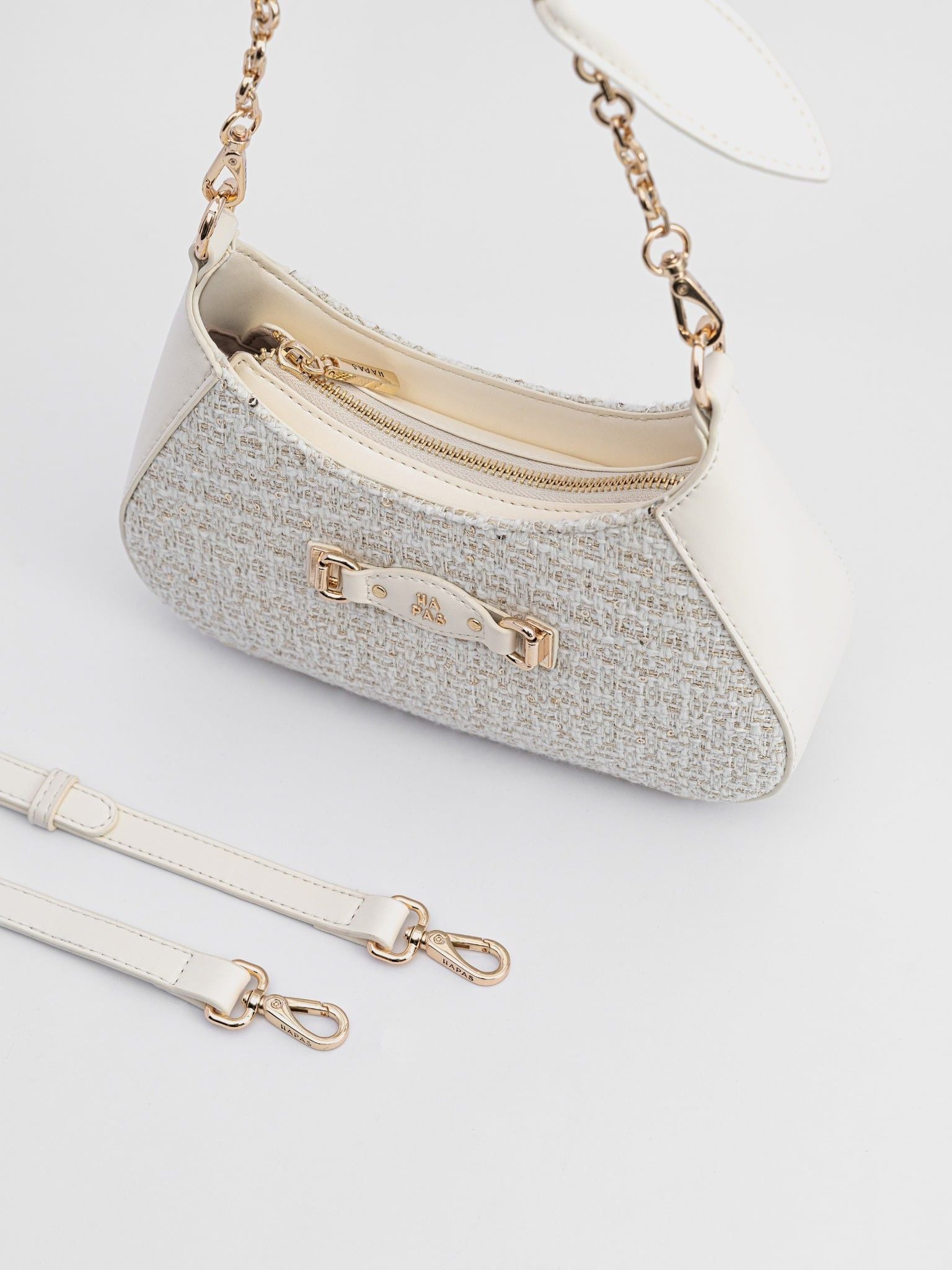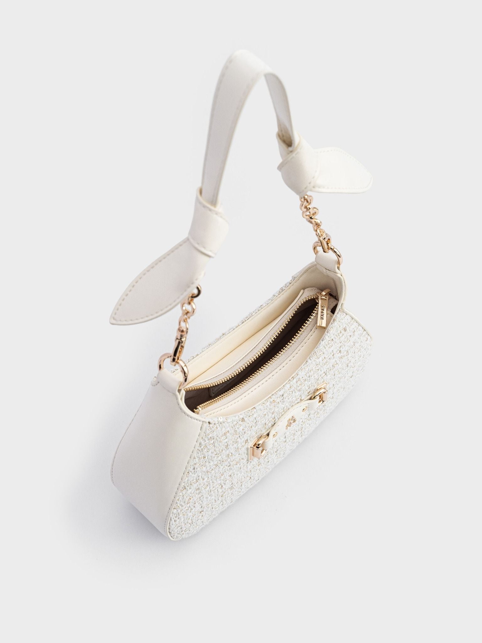 – Quai túi được thắt nơ mềm mại phối cùng xích kim loại ánh vàng